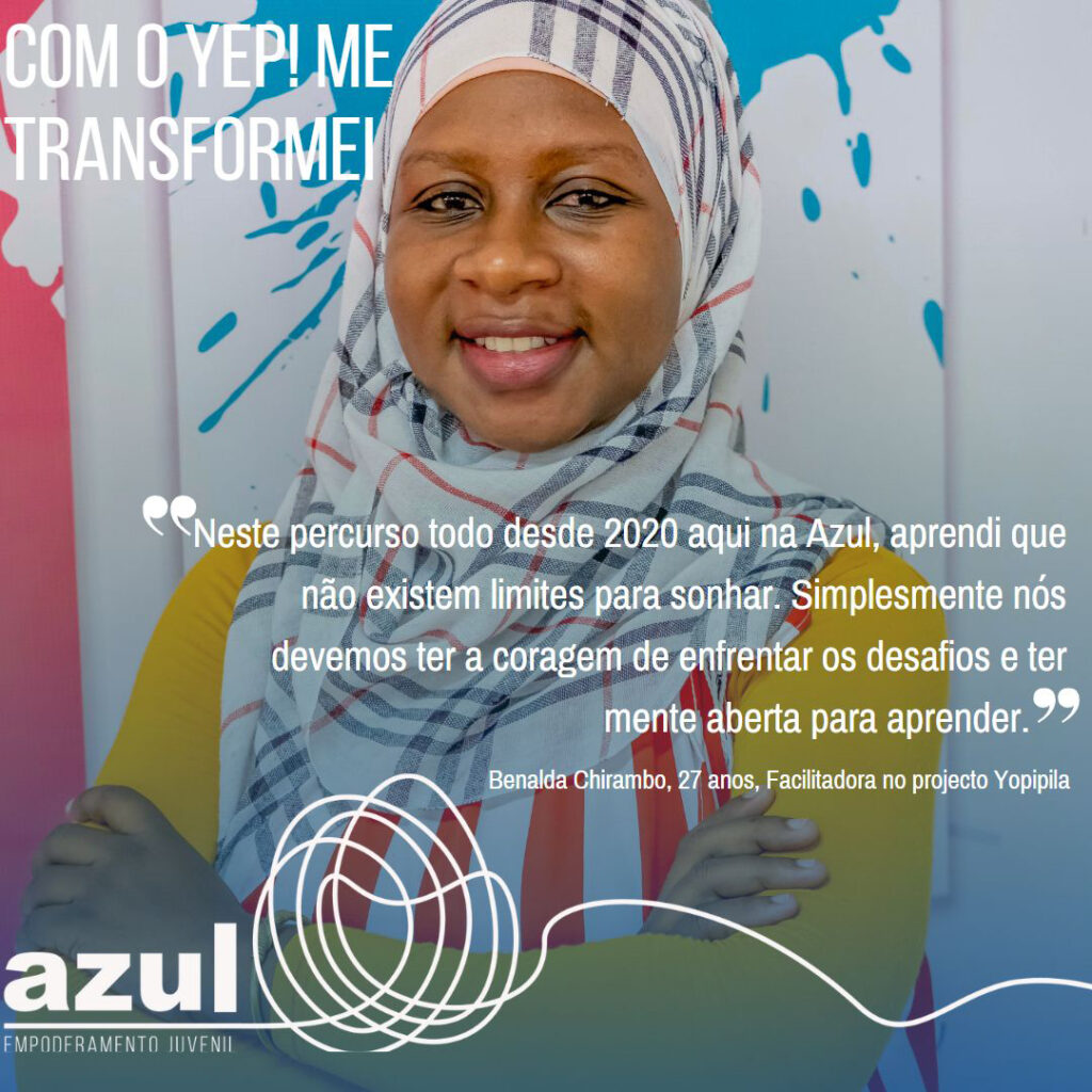 Eu conheci a AZUL através de um inquérito para participar de um treinamento sobre liderança juvenil. Eu participei neste treinamento e foi umas das melhores coisas que me aconteceu no ano 2020. Foi um treinamento que durou 2 meses, em que aprendi a importância de nós como jovens sermos protagonistas na procura de soluções para diversos problemas que nós temos nas nossas comunidades e não esperar pelo governo solucionar. Também adquiri outras habilidades, uma delas sendo habilidade de boa comunicação.
