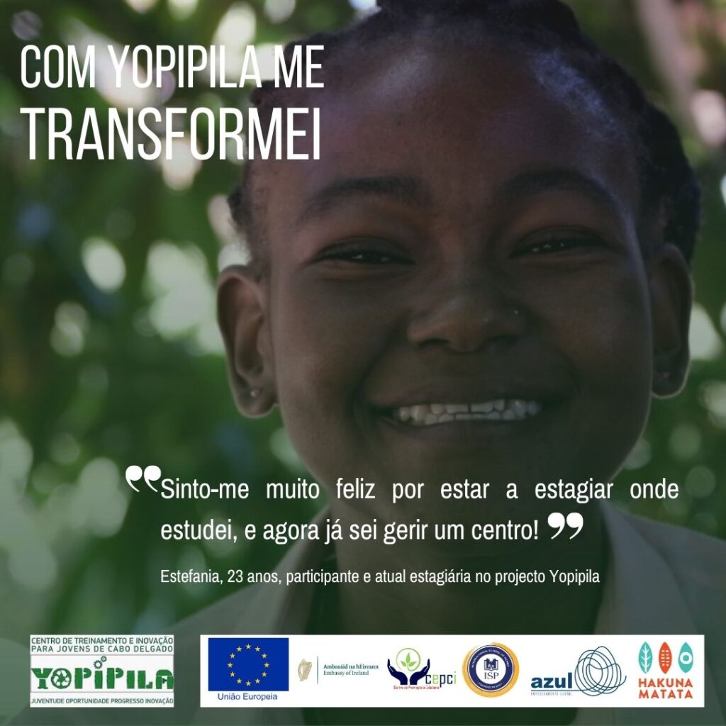 Sou Estefânia Armando Somar, tenho 23 anos de idade e vivo no bairro Eduardo Mondlane. Descobri o projecto Yopipila através dum amigo do bairro da Marriganha, que me disse que havia um projecto em que alguns jovens estavam a se inscrever para ter uma formação. Fiquei muito interessada porque o projecto fala muito sobre tecnologias verdes e meio ambiente, e por não ter o conhecimento específico no assunto, fiquei ainda mais curiosa. Inscrevi-me no Yopipila, tivemos uma conversa de selecção, fui apurada e comecei com o treinamento, onde a minha curiosidade aumentou ainda mais e comecei a aprender muito. Nos treinamentos, primeiro aprendemos sobre habilidades para a vida, depois sobre o mundo do emprego e por fim entrámos no mundo de negócios.