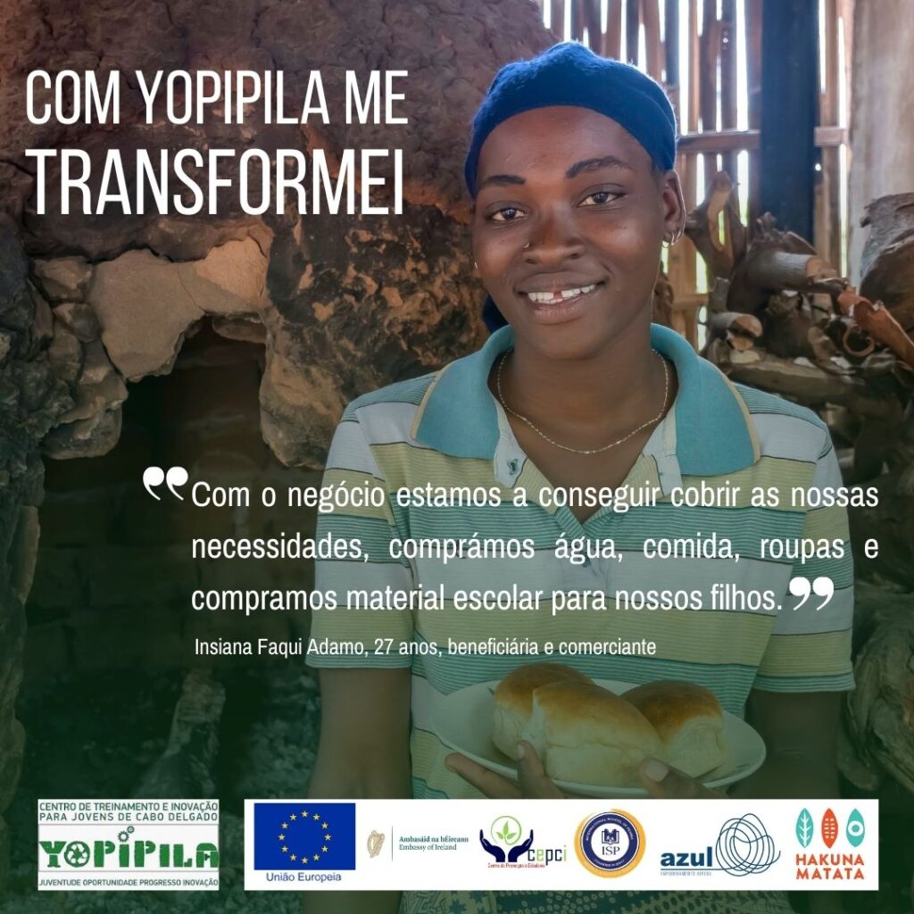 Sou Insiana Faqui Adamo, tenho 27 anos de idade e vivo no bairro de Mahate. Passei pelo centro de treinamento e inovação Yopipila, onde me beneficiei dum componente para aprender a fazer o pão.